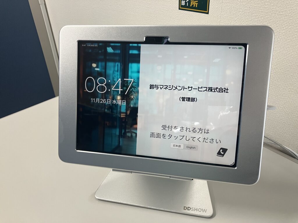 また、受付には新しく、タッチパネル式の受付管理システムを導入し、ご来社いただく皆さまをお迎えします。直感的に操作しやすい仕様になっていますのでご安心ください。