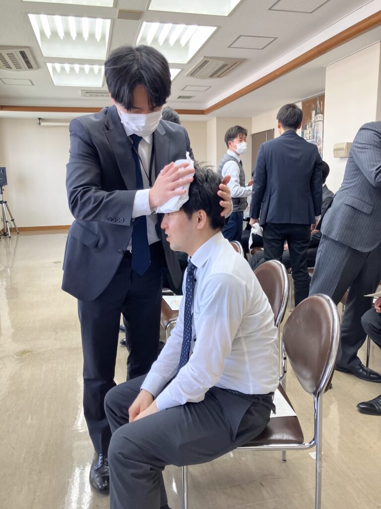 これまで、大規模災害を想定した訓練をメインに実施してきましたが、今回は日常にも使える内容「救急要請と止血」について、約20名の従業員が学びました。