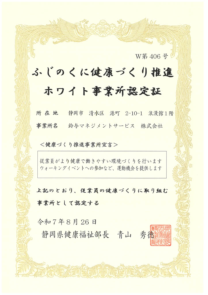会計・資金管理・給与社保業務のスペシャリスト集団として鈴与グループを支える鈴与マネジメントサービスは、グループ共通の経営理念である「共 生(ともいき)」の精神の下、当社にとってかけがえのない財産である従業員の健康保持・増進を「重要な経営施策の一つ」として捉えています。 当社は、これまで以上に働き易く、働き甲斐を感じられる会社を目指し、長期的視点で健康経営に取り組み、従業員の健康保持・増進を図ってまいります。